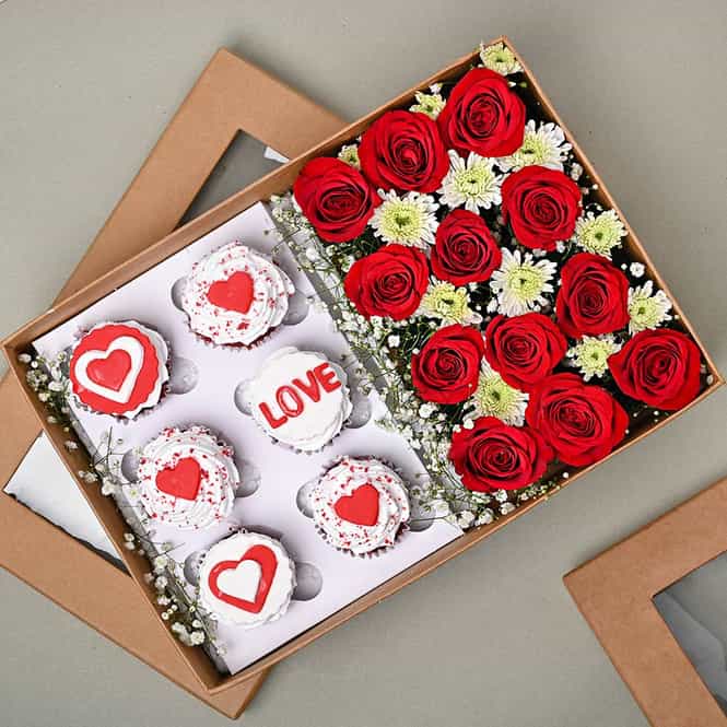 Six ultra-delicious red velvet cupcakes topped with whipped white and red cream creating designs of love are packed in a box along with red roses and ... Read more
