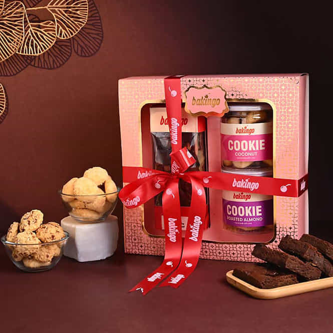 Indulge in a luxurious hamper featuring coconut cookies, crunchy almond cookies, and a rich, dense loaf tea cake. Elegantly packaged, it’s a perfect b... Read more
