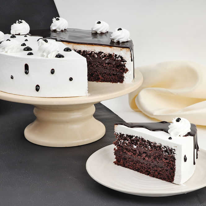 This cake combines creamy vanilla & rich chocolate frosting in equal parts, topped with dollops of vanilla cream & chocolate syrup drizzles for a temp... Read more