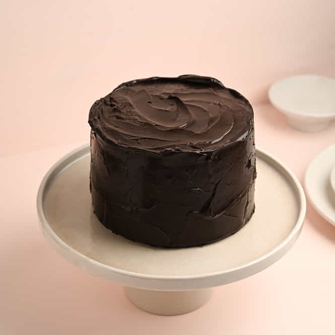 Rich, dark chocolate cake with an abstract, glossy frosting emanating simple elegance and deep cocoa flavour.