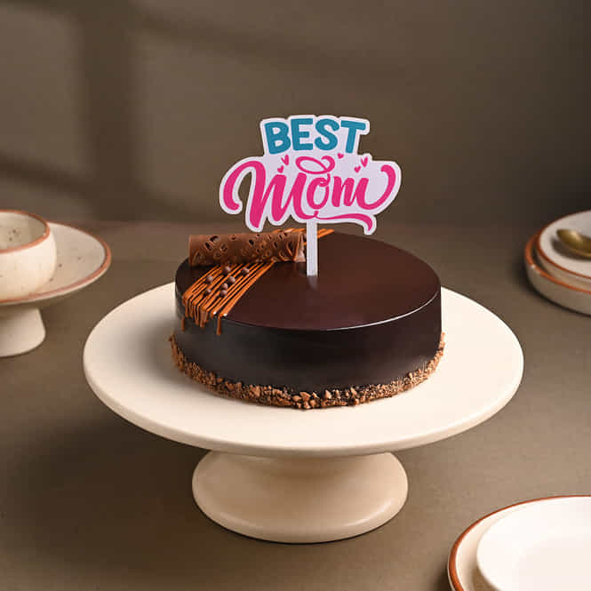 A classic chocolate truffle cake drzzled in rich ganache topped with "Best Mom" cake topper.