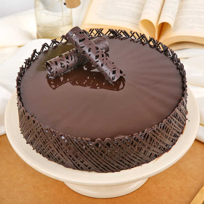 A dark chocolate truffle cake, enveloped in rich chocolate ganache & adorned with chocolate shavings.