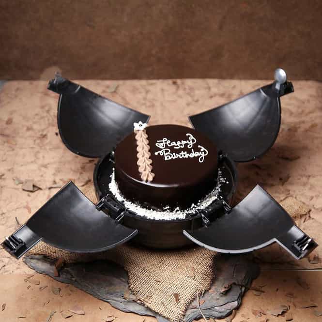 Delicious chocolate cake layers that are layered with chocolate cream & comes encased in a special casing that blasts open on being lit up!