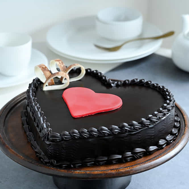 Soft chocolate truffle cake base in the shape of a heart, further topped with a red fondant heart & white chocolate shards.
