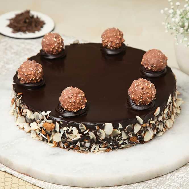 Made of layers of rich chocolate cream, Ferrero Rocher topping, chocolate glaze & roasted crushed almonds side layer.