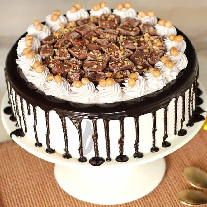 Classic black forest cake with Cadbury 5 Star loaded on the top of rich whipped cream frosting & caramelised balls.