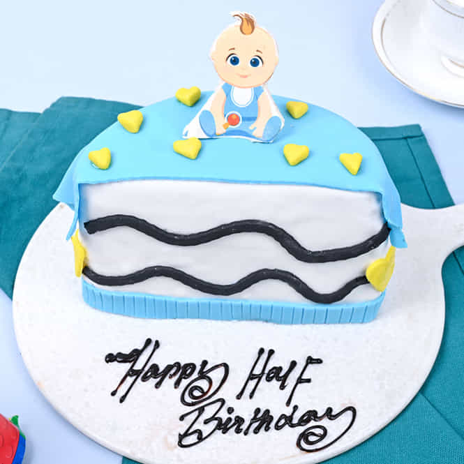 Celebrate with a half-chocolate birthday fondant cake covered in blue & white fondant, featuring adorable yellow heart details & a sugar baby figurine... Read more