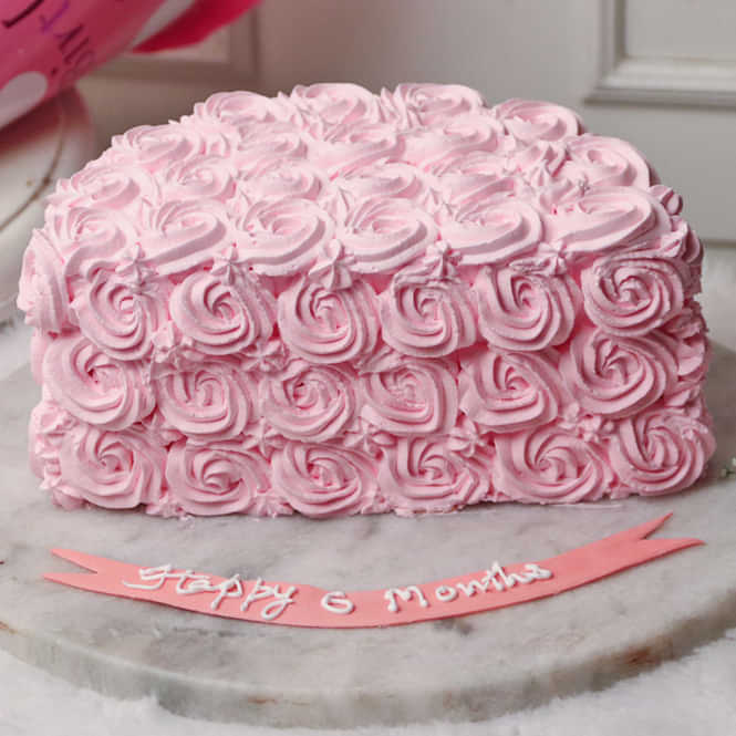 Strawberry flavoured cake, decorated with swirls of pink handmade whipped cream frosting for celebrating 6 month milestones.