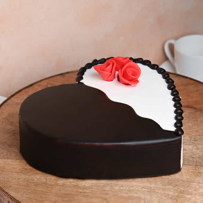 A heart-shaped cake in scrumptious chocolate truffle on one half and vanilla flavour with whipped wh...Read more