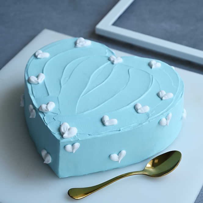 Indulge in this heavenly blue cream heart-shaped pineapple cake adorned with delicate white heart decorations.