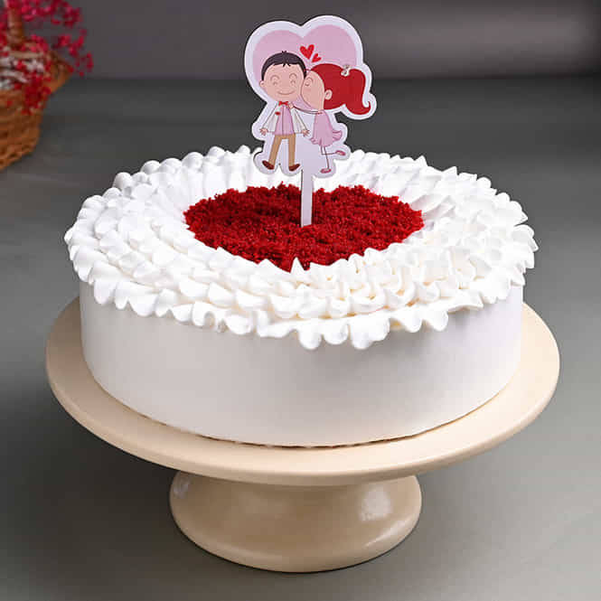 Red Velvet cake featuring a cute couple cake topper nestled in red velvet crumbs and elegantly accented by creamy white designs on the sides.