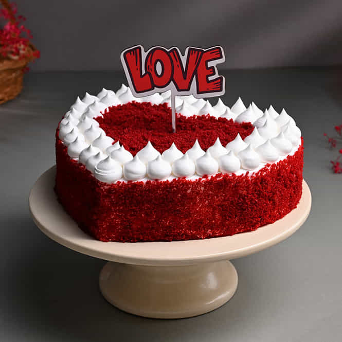 A heart shaped cake with 'LOVE' topper, whipped cream topping & Red Velvet base.