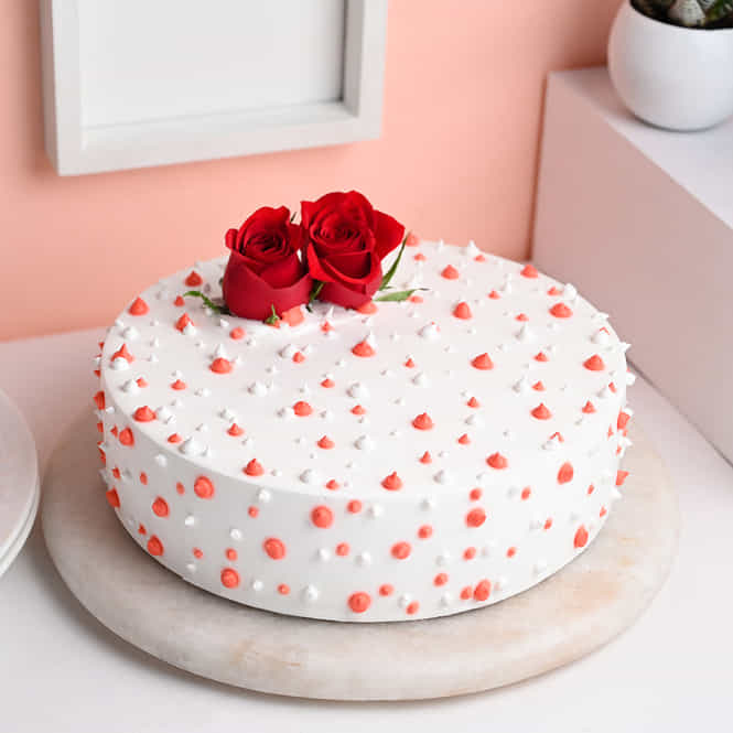 This beautiful cake, brimming with love, is adorned with drops of white and red cream in a whimsical pattern, and is elegantly crowned with two real r... Read more