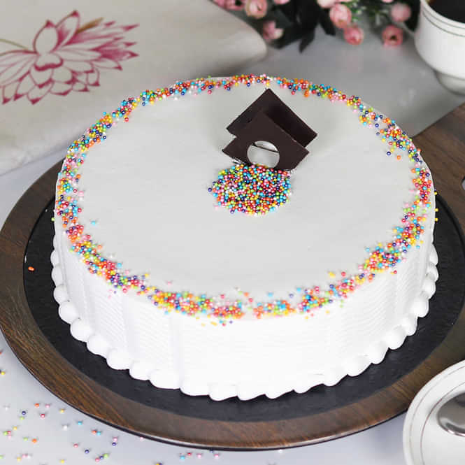 Our vanilla cake comes with whipped cream frosting, vibrant sprinkles, & irresistible chocolate shards on top.