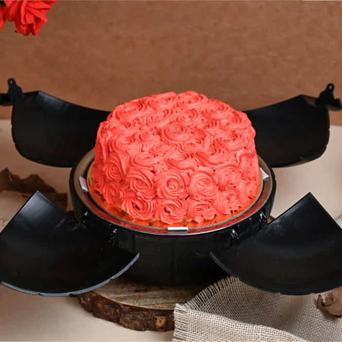 Red velvet cake gets a unique appeal - swirls of red frosting. The cake comes enclosed in our classy bomb cake shell covering.