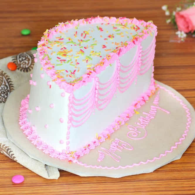 This pink coloured strawberry half cake comes loaded with strawberry flavour sponge cake base & is decorated with colourful rice sprinkles.