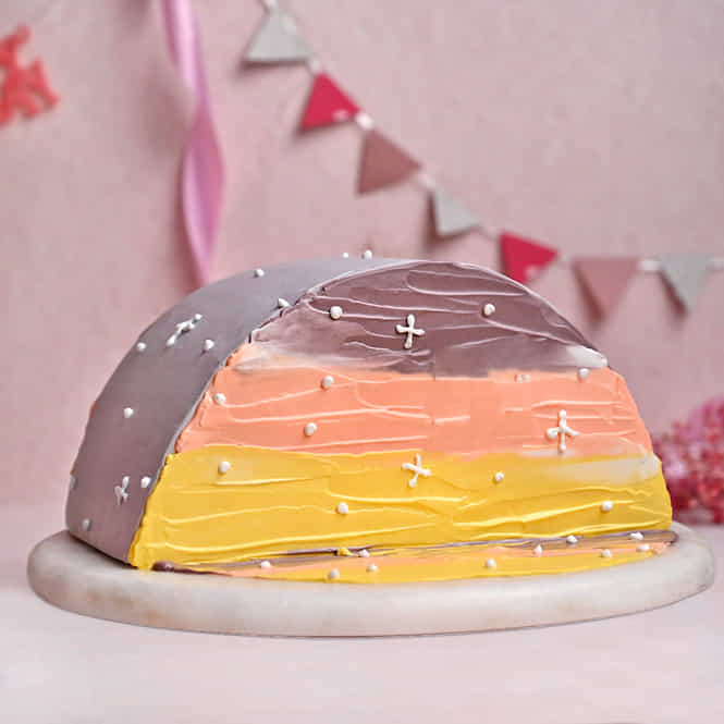 Sweet sunsets half chocolate cake features a stunning sunset-inspired frosting design and starry decorations, perfect for a delightful chocolate treat... Read more