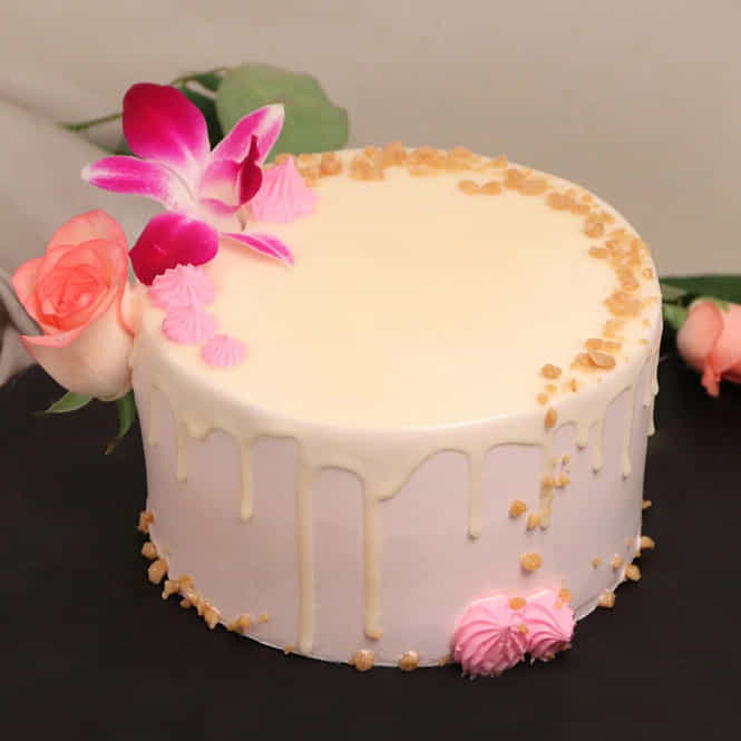 Butterscotch cake adorned with edible flowers and a delightful butterscotch crunch