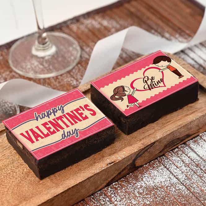 A pair of brownies, made with rich chocolate & walnuts, each crowned with charming Valentine themed artwork.