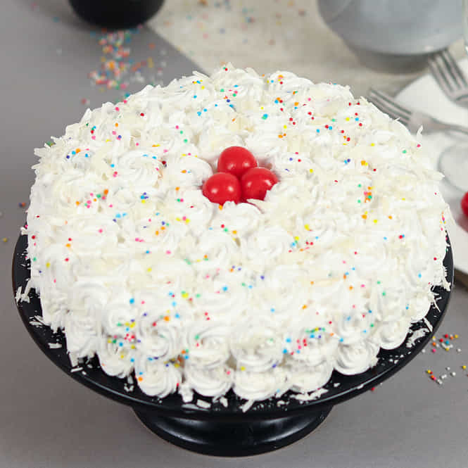 White forest cake heavily coated with whipped cream & colourful sprinkles bursting in every bite. Three red cherries make for a delicious topping.