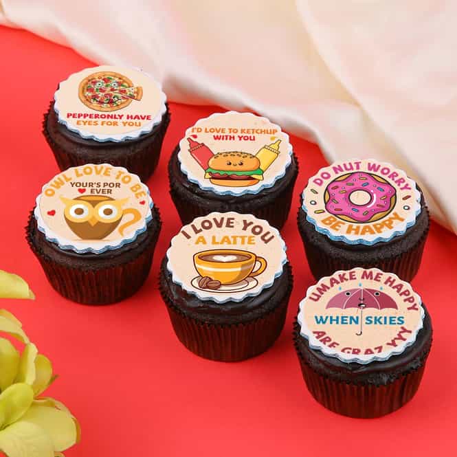 Step into a world of pure chocolate bliss with this set of six cupcakes! These delectable treats are adorned with adorable puns and quirky messages im... Read more