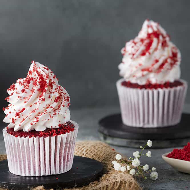 Tender eggless red velvet cupcake topped with wholesome creamy white frosting and red velvet sprinkles.