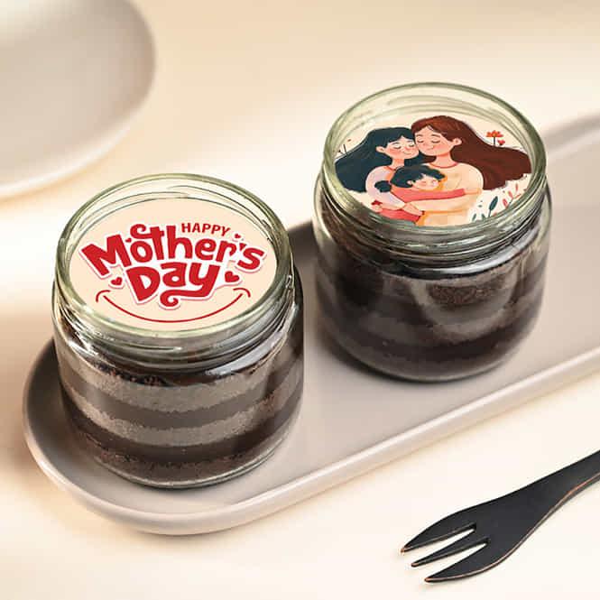 Cherish Mom's love with a Set of 2 Chocolate Jar Cakes. One bears a sweet 'Happy Mother's Day' message, while the other depicts a heartwarming embrace... Read more