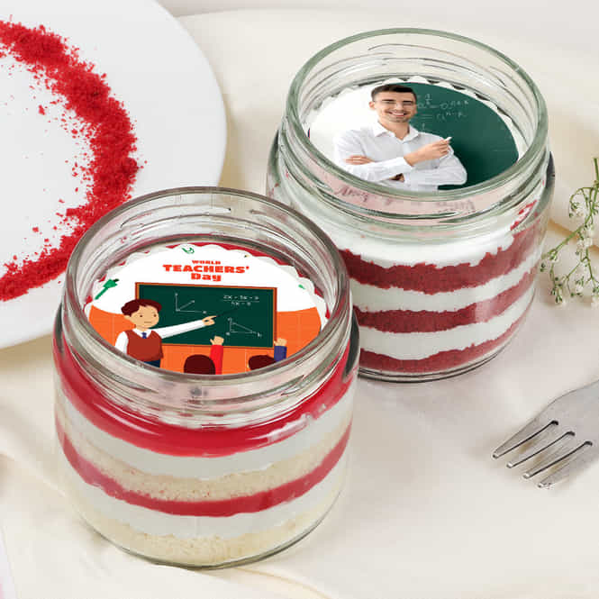 Treat your teacher to this Personalized Happy Teachers Day Red Velvet Jar Cake. Velvety, red velvet cake served in a jar decorated with the words "Hap... Read more