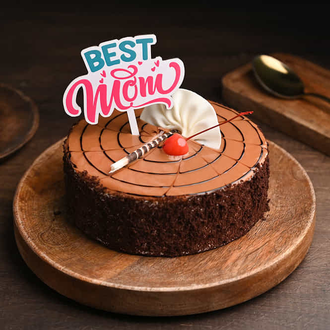 A rich butterscotch cake beautifully garnished with a creamy swirl, a delicate white chocolate leaf, and a bright red cherry. Topped with a "Best Mom"... Read more