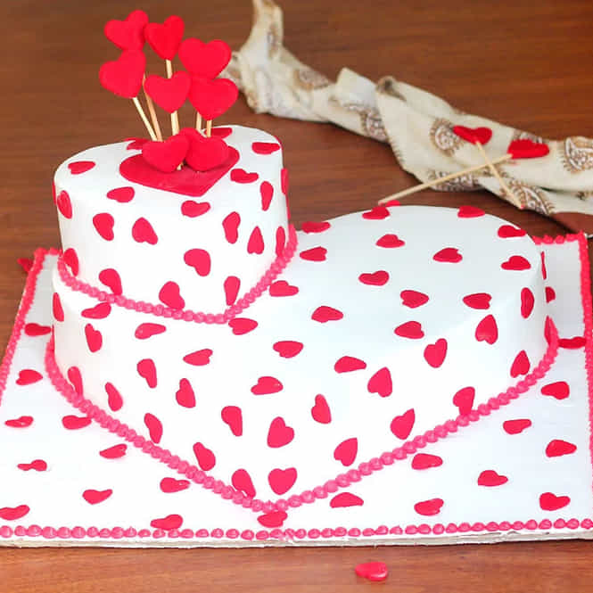 Celebrate a special occasion with this red and white heart-shaped 2-tier fondant cake topped with little red hearts and decorated with red hearts on a... Read more