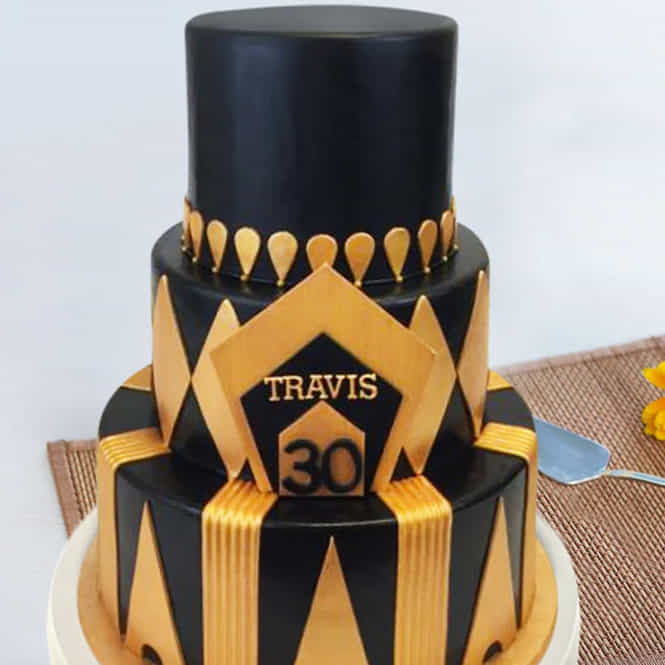 It's party time so rejoice and order this stunning fondant party cake getting it made any of your favourite flavours. This royal black and gold fondan... Read more