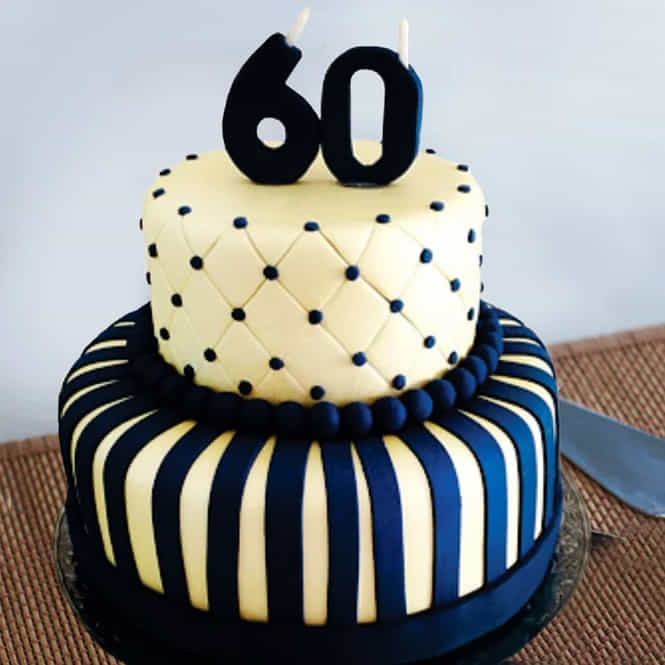 The two-tier fondant cake is impressively decorated with a combination of navy blue and cream colour. With a look of something covered in velvety fabr... Read more