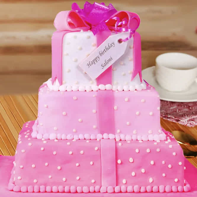 A pretty-pink indulgence for sweet temptations. The three tiers of the cake are dressed in pink fondant in an ombre gradient. The cake is decorated wi... Read more