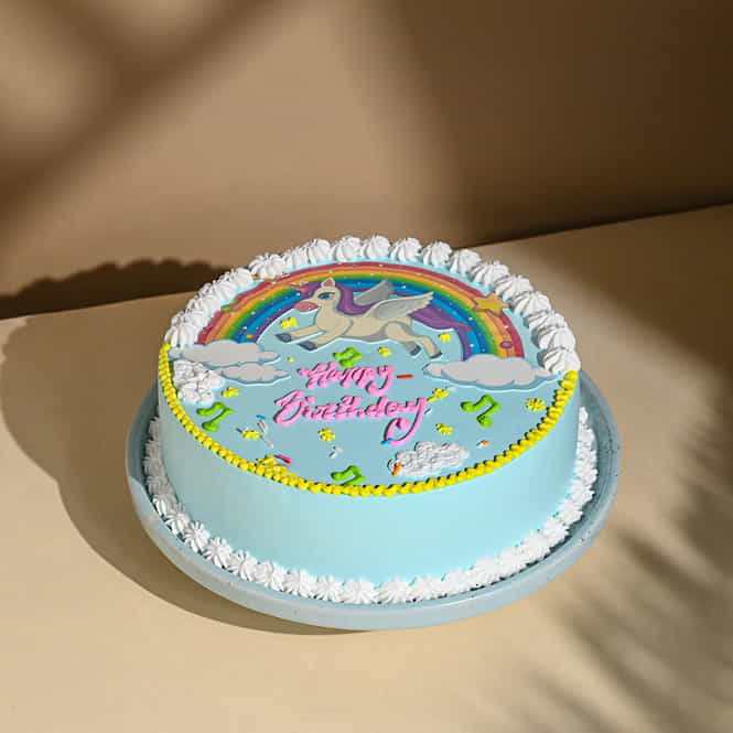 Delight in our enchanting Unicorn Rainbow Cake, adorned with colourful rainbows and whimsical unicorns on an edible image. Perfect for making any birt... Read more