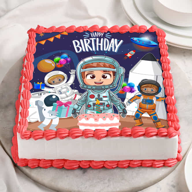 Celebrate your little one's special day with a cosmic twist! This space-themed cake, gracing 'Happy Birthday' text, adorable astronauts, and vibrant b... Read more