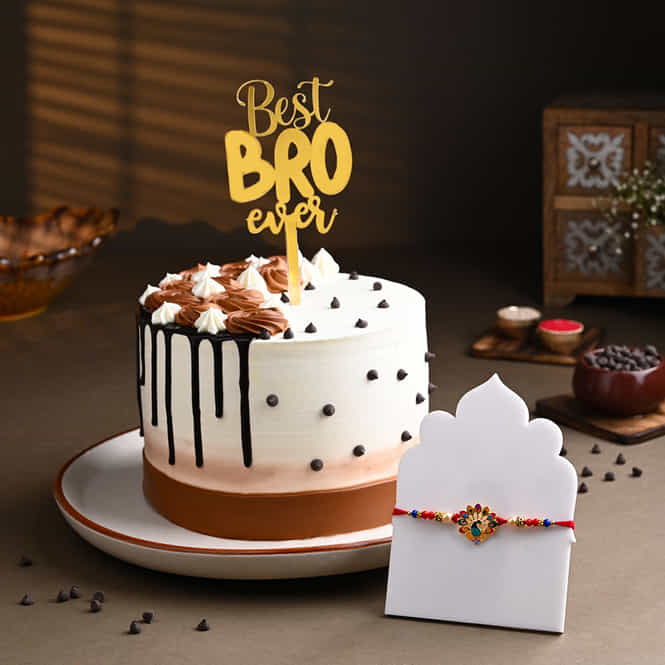 Honour Raksha Bandhan with a stunning Rakhi, symbolising love and affection. Paired with a chocolate cake topped with 'Best Bro', this gift set sweete... Read more