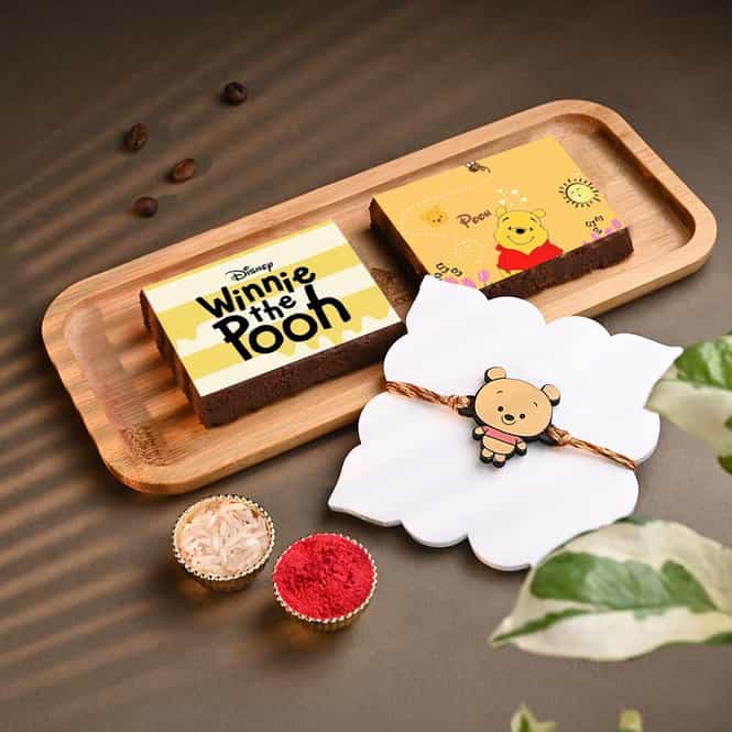 Celebrate Raksha Bandhan with two adorable Winnie the Pooh chocolate walnut brownies paired with a cute Pooh Rakhi. A delightful, coordinated treat th... Read more