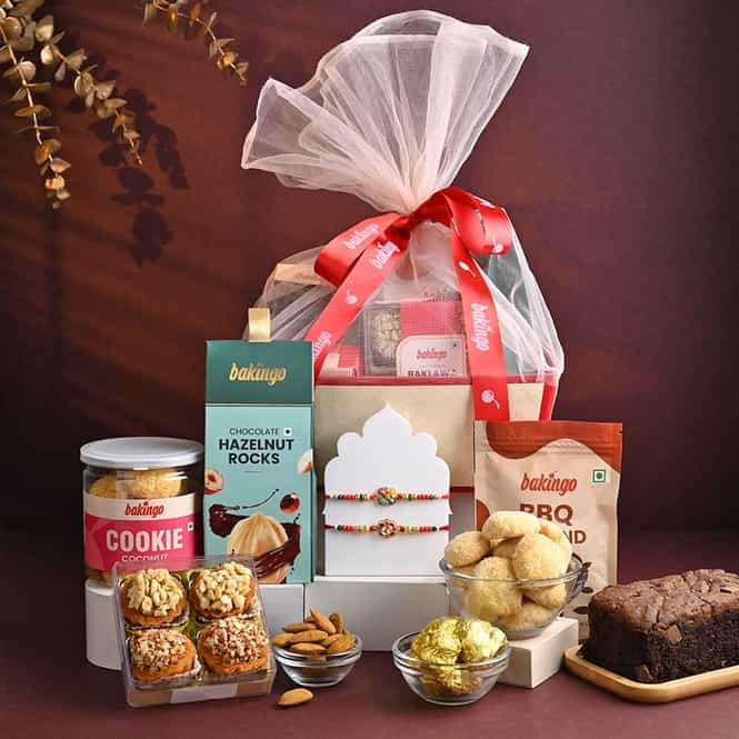 Celebrate Raksha Bandhan with this delightful hamper featuring a dense loaf tea cake, coconut cookies, BBQ almonds, a set of baklava tarts, hazelnut r... Read more