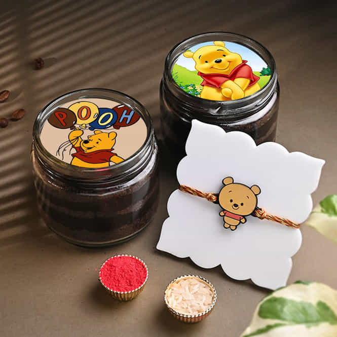 Pooh Choco Jar Cake Duo With Pooh Rakhi