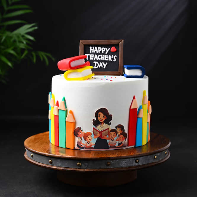 Celebratory cream cake adorned with sugar sheet illustrations of students, teachers, crayons, and a chalkboard for Teacher's Day.