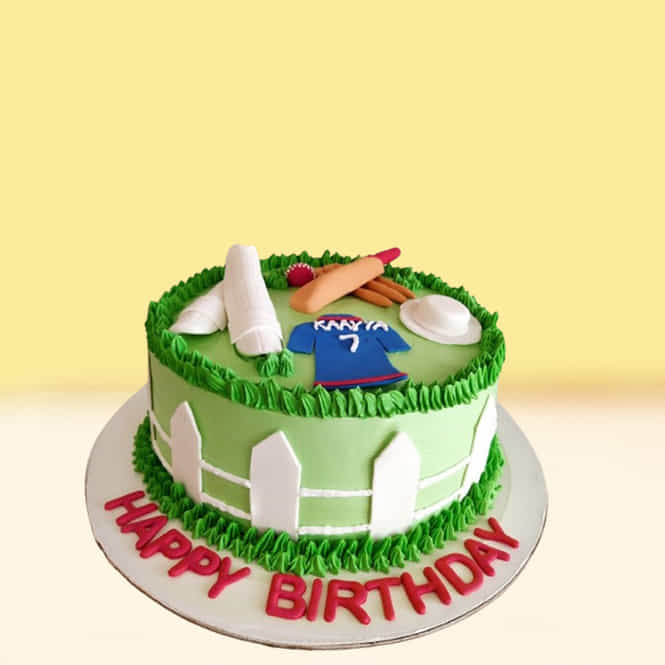 Hit a century with this cricket-themed birthday cake, featuring a vivid green fondant field, iconic cricket elements, and a realistic 'grass' icing ed... Read more