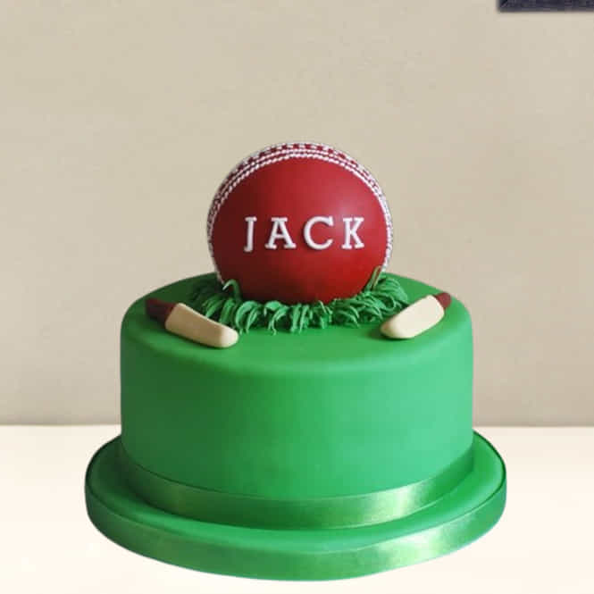 Score big with this cricket-themed fondant cake, featuring a vibrant green field cake base and a meticulously crafted cricket ball.