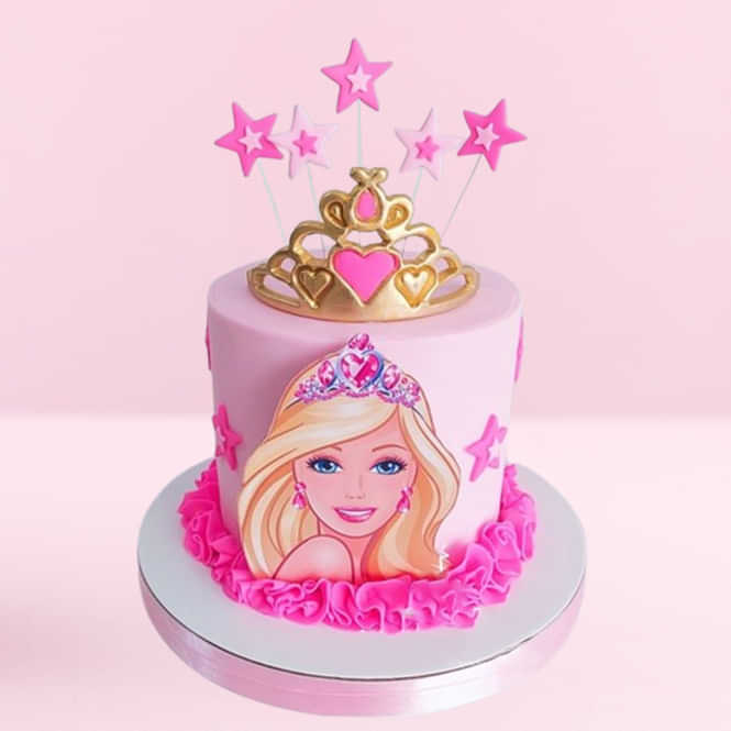 A combination of fondant, cream, and sugar sheet creates this Barbie-themed cake, a sweet symphony of fantasy and flavour, crowned with a sparkling ti... Read more