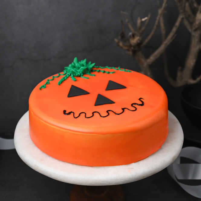 Gift your loved ones this gorgeous jack o'lantern pumpkin Halloween themed orange coloured round cake that is vanilla flavoured. Here is a mouth water... Read more
