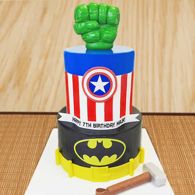 Adorned with the Hulk's fist, Captain America's symbol, and Batman's logo, this fondant cake is sure to uplift the spirit of your kid's birthday celeb... Read more