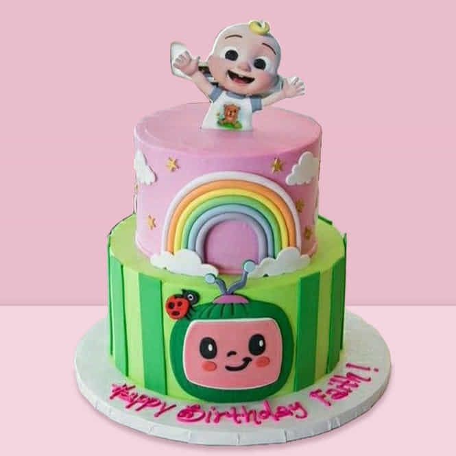 A two-tiered Cocomelon-themed cake with the show's logo, rainbow, and clouds, all crafted from fondant. Topped with a baby's image on a sugar sheet, i... Read more